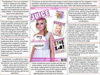 The document provides details on the design of a magazine cover and contents page for a teenage girl target audience. Key elements included a bold masthead in the top left, a celebrity cover image and teaser lines. The contents page uses sections and informal language to organize and preview magazine content appealing to teenage girls. Consistent colors, fonts and positioning are used throughout for brand recognition and readability.