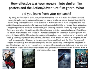 The research into other film posters and the action/adventure genre was very helpful for the student. It taught conventions like including background action and informed choices for the key image, color, and fonts. The research also provided ideas for the student's own film idea. For the posters, creative decisions were needed for the background image and styling of the key image. The finished posters generally followed film poster conventions but could be improved with different font and image choices. The posters appeal to both male and female audiences and are quite successful overall, though some elements like the font and image quality could be better.