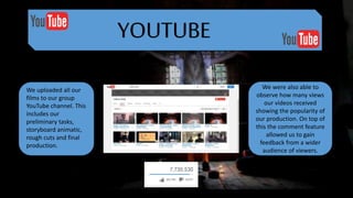 The document discusses using various online tools for filmmaking. It describes uploading films and receiving feedback using a YouTube channel. It discusses using Blogger collaboratively to share work and receive feedback from teachers and classmates through comments. It describes using Prezi to create dynamic presentations with multimedia and fluid navigation. It also discusses editing films using Adobe Premiere Elements, including adding effects, audio, and titles. Finally, it outlines some technical difficulties encountered during filming, such as battery life, memory limitations, lighting challenges, and keeping equipment out of shots.