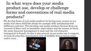 1) The product develops conventions of real horror media by featuring scary female characters and child-like elements like dolls, playing into stereotypes.