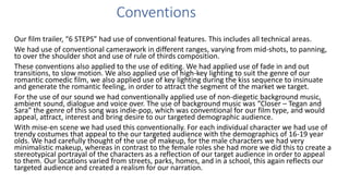 The document evaluates the strengths and weaknesses of a film trailer titled "6 STEPS". It summarizes the conventions used in technical areas like camerawork, editing, sound, and mise-en-scene. It also discusses the representation of main characters as stereotypes meant to appeal to the target demographic of 16-19 year olds. Some planned elements like a tracking shot were cut, while others like shot reverse shot were effective. The strengths included proper use of techniques to engage the audience, but weaknesses included lack of complex camerawork and timing issues.