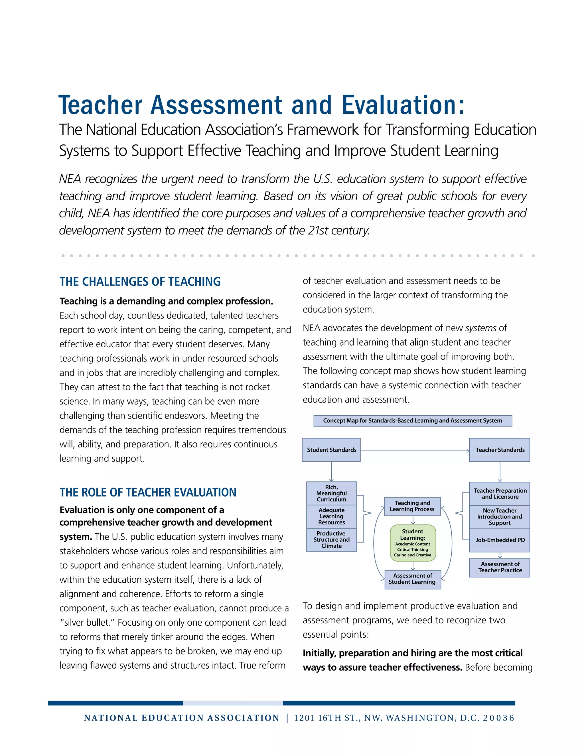 This document discusses the National Education Association's framework for transforming teacher evaluation systems. It argues that current systems often fail to improve teaching or support growth. The NEA advocates for a comprehensive system with two components: ongoing formative assessments to support growth, and periodic summative evaluations to guide employment decisions. Formative assessments should be non-punitive and involve self-reflection, peer feedback, and professional development. Summative evaluations must be based on clear standards and allow time for teachers to improve, with due process before removal. Overall the goal is continuous professional learning to enhance teaching and student learning.