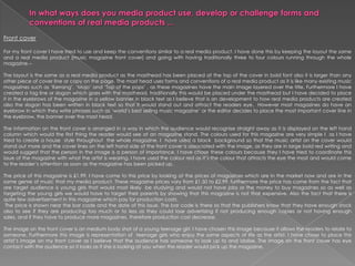 The document describes the process of creating a music magazine media product. It discusses using conventions from real music magazines in the layout, design and content. The front cover includes a masthead, tagline, artist image and bold text. The contents page features regular articles and images. A double page spread includes a headline, standfirst, columns of text and character profile. The target audience is described as girls aged 10-16, and their parents. Distribution through Bauer Media Publications is proposed to appeal to a wide audience. Learning experiences using software like Photoshop and InDesign are discussed.