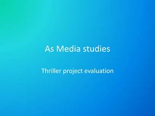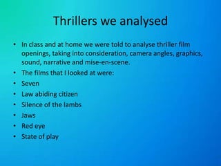 The document summarizes a student's analysis of thriller film openings, and evaluation of their own thriller film project. The student's film took a psychological approach rather than focusing on police/criminals. It followed criteria to avoid weapons/attacks and make the audience think about the storyline. The film's conventions included a transformed city and mazes/labyrinths. It would likely be distributed online or to other student filmmakers due to its low budget. No major problems occurred during the film's production.