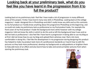 Looking back at their preliminary task for designing a college magazine, the student feels they have learned many new skills that allowed them to create a more polished final product. Specifically, the student gained proficiency in Photoshop which helped them design a more professional front cover and edit photos. They also became more comfortable using their blog to upload and share their work. The progression of skills acquired between the preliminary and final tasks helped the student produce a product that met higher professional standards.