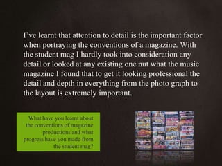 The student has learned that attention to detail is important for magazine production. With the student magazine, they did not consider details and layouts of existing magazines, but with the music magazine they focused on professional details in photos and layout.