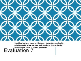 The document discusses the improvements made from the author's preliminary editing task to their final film product. Key areas of growth included stronger editing skills like smoother transitions between shots, improved camera work using a tripod for steady shots, the addition of sound effects and music, and greater attention to continuity across costumes, lighting, and more. Conducting both the preliminary and final projects provided valuable lessons and experience that will allow the author to continue progressing their filmmaking abilities.