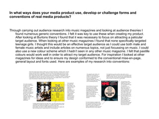 The document discusses the design and target audience of a magazine the author created. They aimed to target teenage girls by using pastel colors, images of fashionable female musicians, and articles on topics of interest to that group like music and celebrities' personal lives. Through their research of existing magazines, they incorporated conventions like two-column text layout but also introduced unique elements like an unconventional color scheme. The target audience is analyzed in terms of their motivations and how the magazine content appeals to and addresses them.