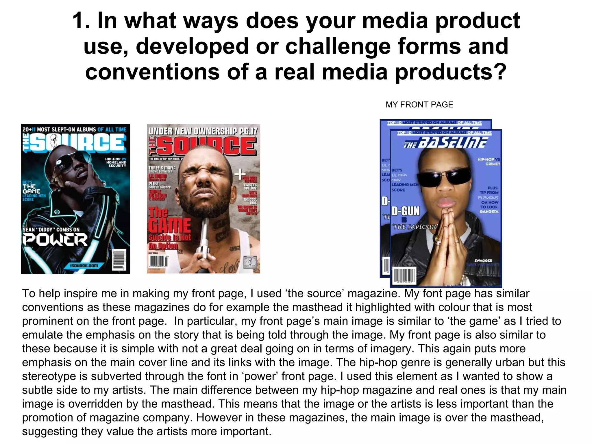 1. The document describes the process of constructing a hip-hop music magazine as a media product.