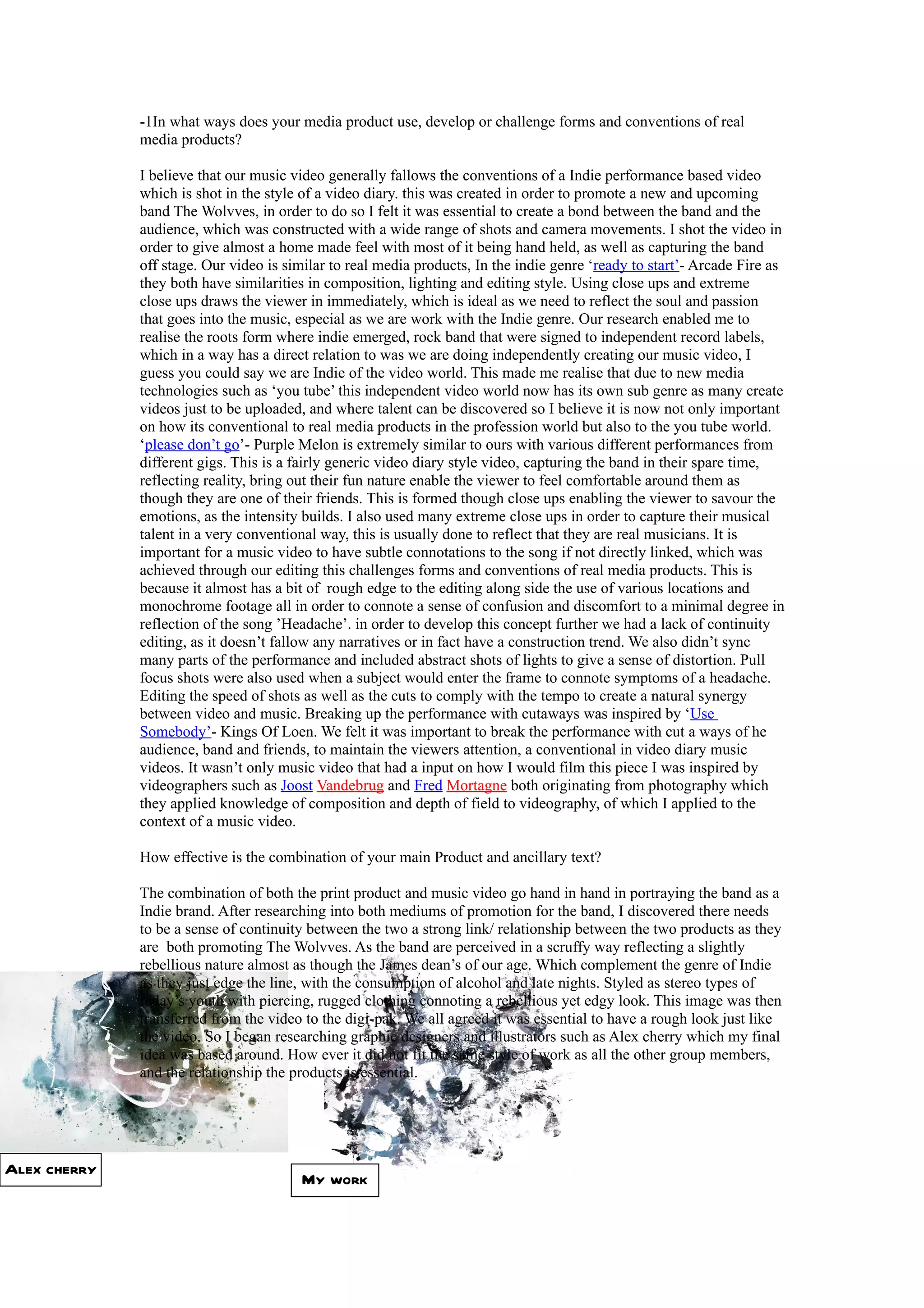 The document discusses a music video created for an indie band called The Wolvves. It seeks to promote the band in a style similar to real indie music videos on YouTube. Audience feedback was incorporated which led to adding more off-stage footage of the band to break up the performance clips. The print product and music video were designed to have a consistent scruffy, rebellious style through illustrations and color schemes to effectively promote the band across mediums. New media technologies facilitated efficient online research, planning, distribution and evaluation.
