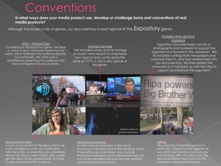 The document summarizes the conventions used in the student's documentary project. It discusses how the documentary follows the conventions of the expository genre through the use of a voiceover, archive footage, images, editing techniques, interviews, and anonymity. It also compares the documentary to similar media products like the Channel 4 series Dispatches that cover current affairs topics. The document evaluates how technologies were used at different stages of production and how their use improved the piece. It reflects on how the student's skills have progressed since their previous media project.
