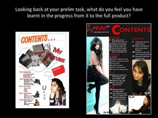 This document discusses the key aspects of designing a music magazine for a target audience of 15-20 year old male and female students and part-time workers who enjoy music. It addresses questions about the best color scheme, artists and content to feature, font and layout choices, price point, and how to attract and represent the target demographic. The document also reflects on what was learned about publishing technologies and progress made from an earlier preliminary task to the final magazine product.