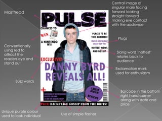 This document provides an analysis of the design elements used across the front cover, contents page, and interior pages of a magazine. Key design elements discussed include the use of bold colors like red to attract readers' attention, buzzwords to engage audiences, consistent mastheads to maintain branding, and conventional formatting choices for page numbers, titles, and text layout. The analysis notes how these techniques are employed to create a cohesive visual identity and appeal to readers while following standard publishing conventions.