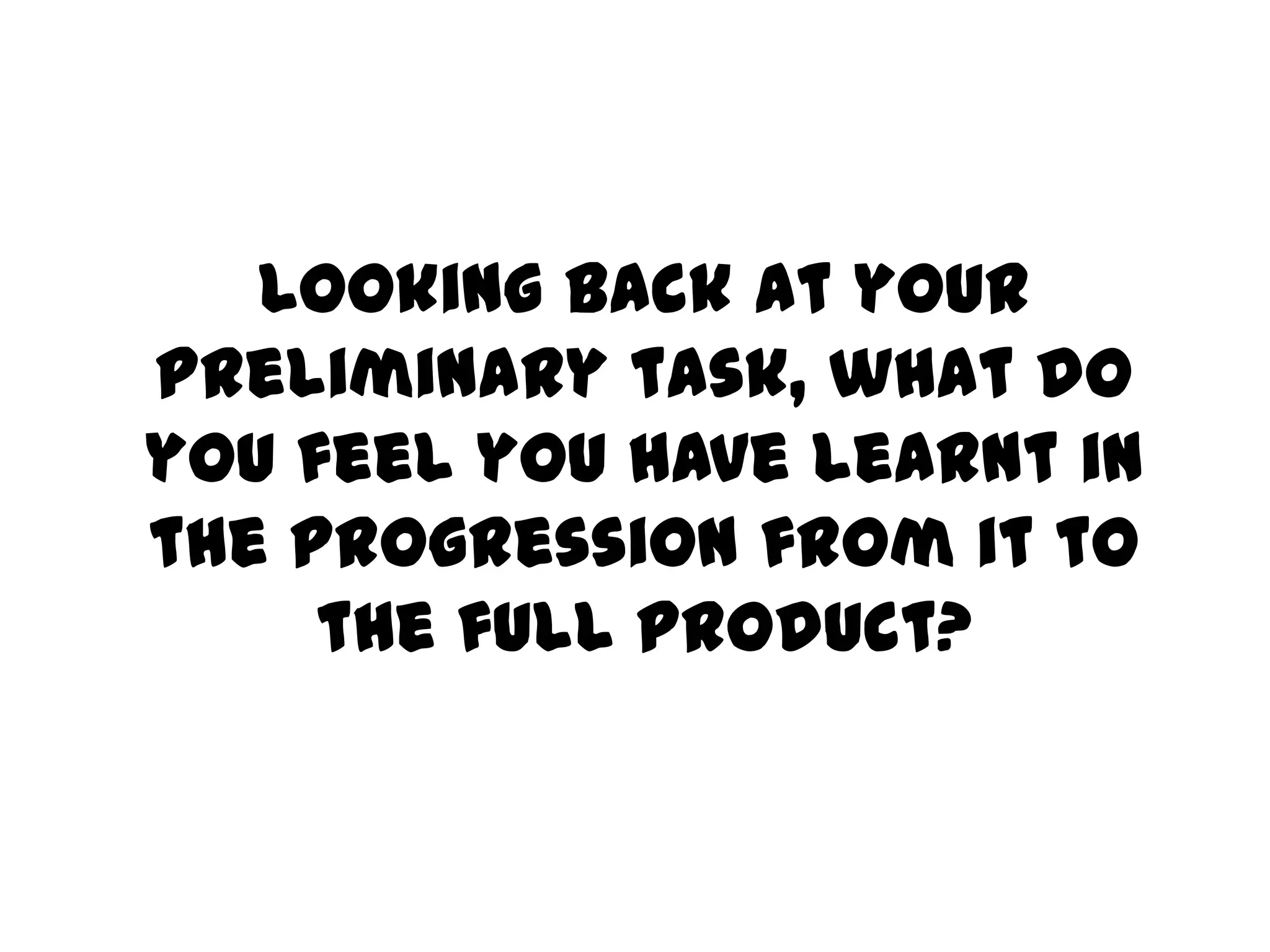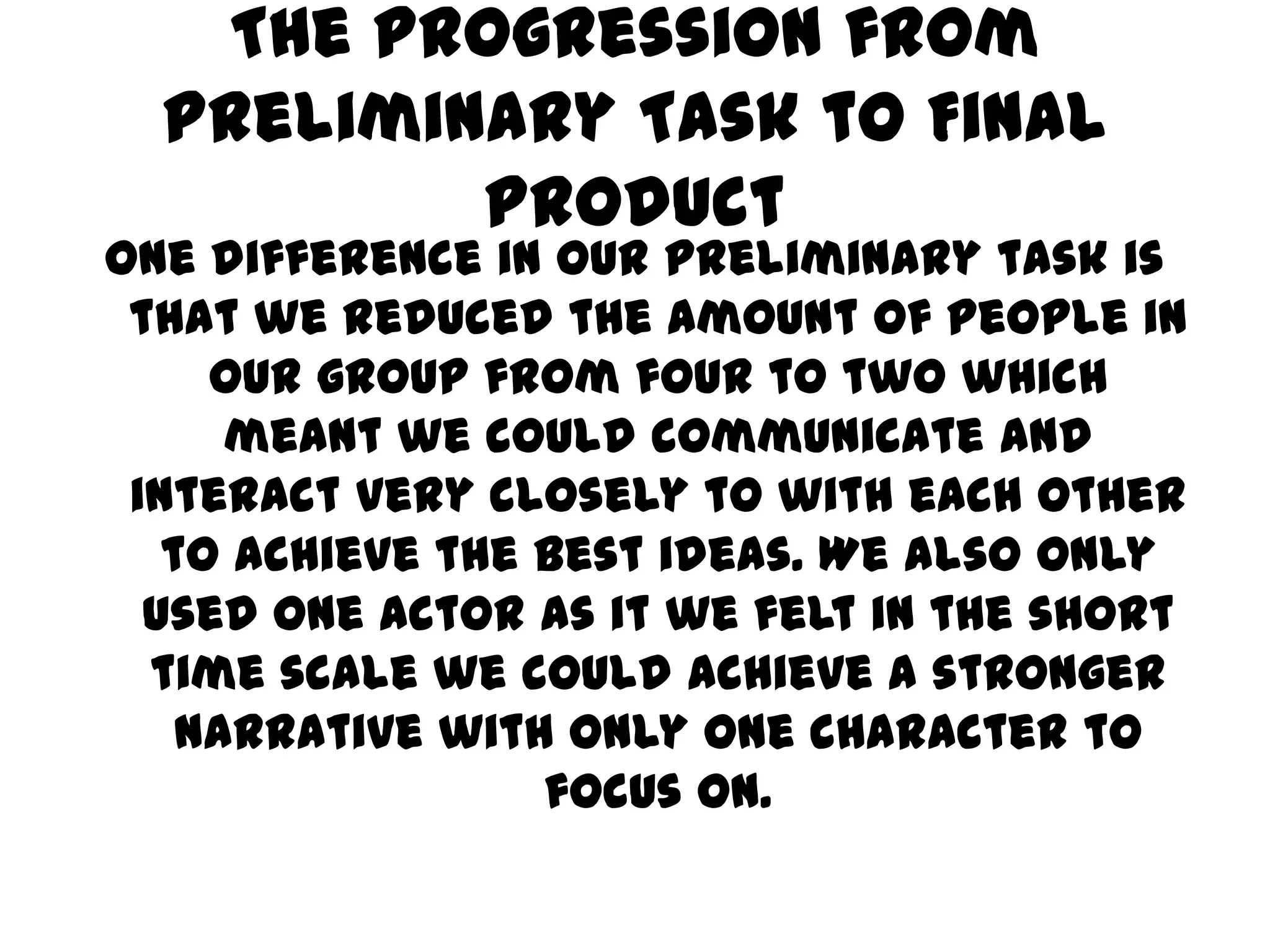 The document discusses the learning and progression between a preliminary task and final product for a film project. Key learnings included reducing the cast to improve focus, using titles that related to the content and audience, incorporating effects like lighting and shadows to create atmosphere, varying shots from different angles and levels to make the final product more interesting, improving match on action between shots, properly organizing equipment like tripods, learning computer editing software which led to much smoother editing, and developing a positive mental attitude to produce a higher quality final product.