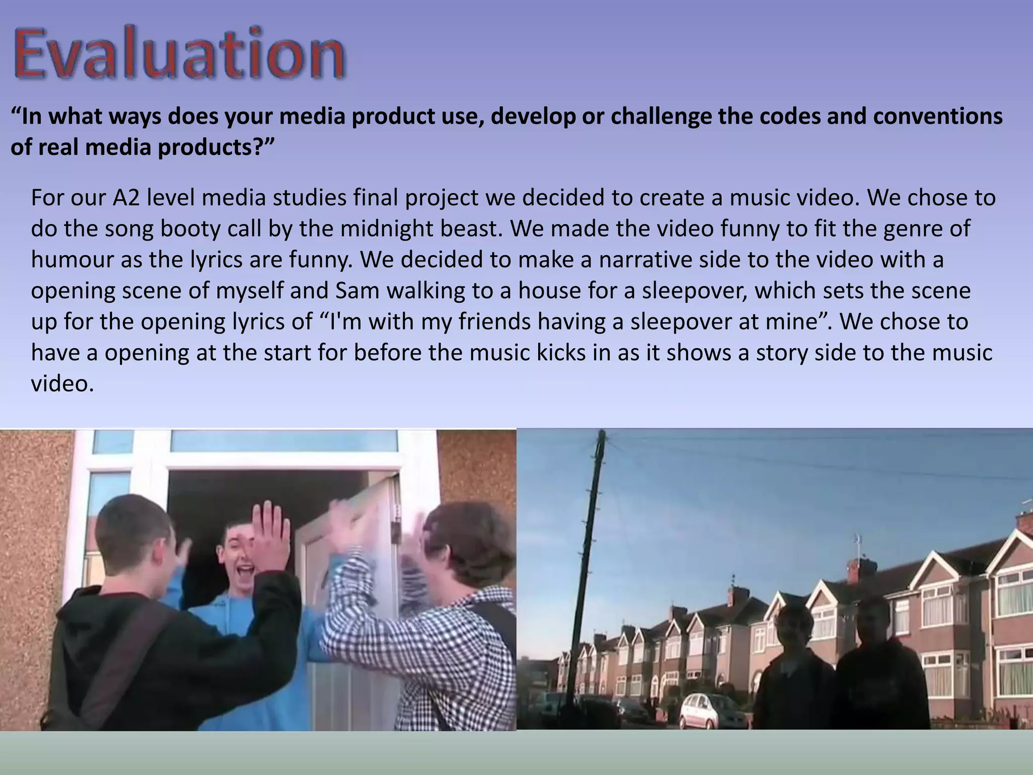 The student created a music video for the song "Booty Call" by the band Midnight Beast. They aimed to make the video funny to match the humorous lyrics. It includes scenes of the student and a friend walking to a sleepover, cutting between shots that follow the fast-paced lyrics. The video and accompanying album cover were designed to look low-budget and amateurish since the band is unsigned. Feedback from friends and teachers helped the student improve syncing issues and weak shots.