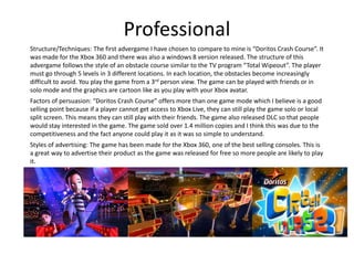 The document compares the student's advergame, TV advert, and print advert projects to professional examples in each medium. For the advergame, it is compared to "Doritos Crash Course" and found to be less complex with only single player modes. The TV advert is compared to an Adidas advert featuring Paul Pogba and is found to have some similar editing techniques but lacks a storyline. Finally, the print advert is favorably compared to a Call of Duty 4 poster for its simplicity, though the photoshopped elements could be improved. Overall, the student aims to advertise Irn-Bru across the projects but notes areas for development, such as adding more complexity and layers.