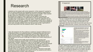 The document provides an evaluation of the author's research, planning, and execution of a campaign to challenge stigma surrounding rape culture. Regarding research, the author looked at other organizations' work to gain ideas and inspiration, and conducted a survey to understand their target audience. For planning, the author created a timeline but did not stick to it closely. Mock-ups and mind maps helped in planning final pieces. The campaign purpose was to challenge stigma and raise awareness, and the author's work fits this purpose well. While the target audience was primarily 16+, content was appropriate and professional without being patronizing. Messaging clearly communicated the stigma surrounding rape culture through direct, simple visuals and text.