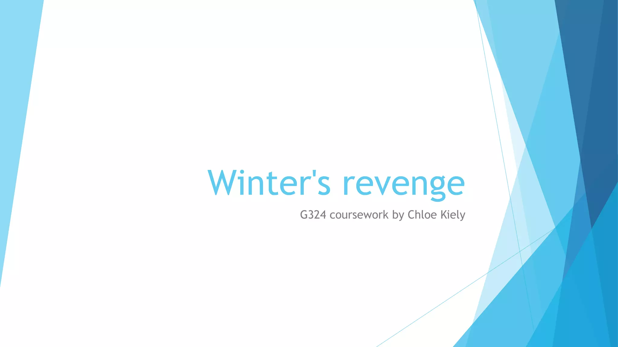 Logan goes crazy and seeks revenge after his little sister is murdered by a gang. Chloe Kiely created a horror film trailer called "Winter's Revenge" about this story, along with two ancillary products - a film magazine and poster. She used feedback from audiences and teachers throughout the process to improve her work. Chloe researched film genres and used conventions like dark lighting and colors in her products to match the horror theme. The clock prop is featured prominently as it symbolizes the sister's death.