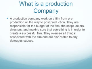 A production company oversees all aspects of filmmaking from pre-production through post-production and is responsible for the budget, script, actors, and ensuring a successful film. Terror Craze Productions is a new production company that chose its name to sound professional and indicate it is a production company. A distributor handles marketing, promotion, release dates, and distribution of a film to theaters and home release. For their small-budget film, Terror Craze Productions would choose a smaller distributor like Lionsgate in the UK to first release in art house cinemas then DVD, Blu-Ray, and on demand, in order to distribute the film cost effectively within their means as a new, small production company.