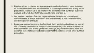 The document summarizes feedback received from audiences of a short film production about a terminal illness. The filmmaker was pleased that audiences understood the drama genre and narrative. Most felt the acting was strongest while cinematography needed more creative angles and shots. The filmmaker learned the importance of clear genre and narrative for audience understanding. They would improve shots of a letter and card to clarify character relationships and confuse fewer viewers about who a letter was intended for. The filmmaker was happy with cast performances but felt lighting and more creative camera angles could strengthen future productions.