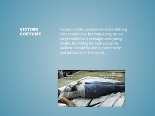 By dressing the victim in youthful clothing, the audience of teenagers and young adults would be able to relate to her and feel sympathy. The static and edited footage of the "killer's recording" builds intrigue and suspense, leaving the audience wondering what is happening. Seeing the events through the perspective of the handheld camera the "killer is holding" makes the audience feel like they are present and involved in the action. The killer's identity is kept hidden until the end to provoke the audience's curiosity and encourage them to continue watching to discover who committed the crime.