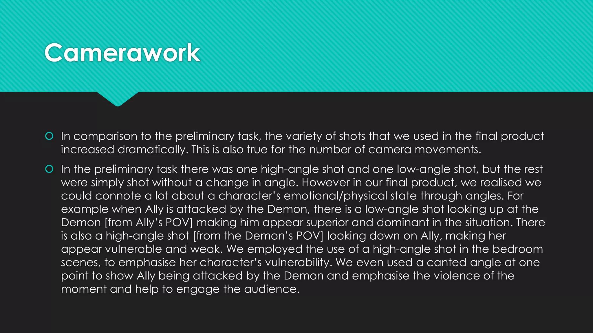 The document evaluates the progression from a preliminary task to a final product in filmmaking, highlighting significant improvements in camerawork, editing, and composition. Key advancements include a wider variety of camera shots and movements, more sophisticated editing techniques such as parallel editing, and enhanced use of lighting, costume, and sound to convey character emotions and themes. It reflects on the application of film rules like the 180-degree rule and match on action to create a more engaging final piece.
