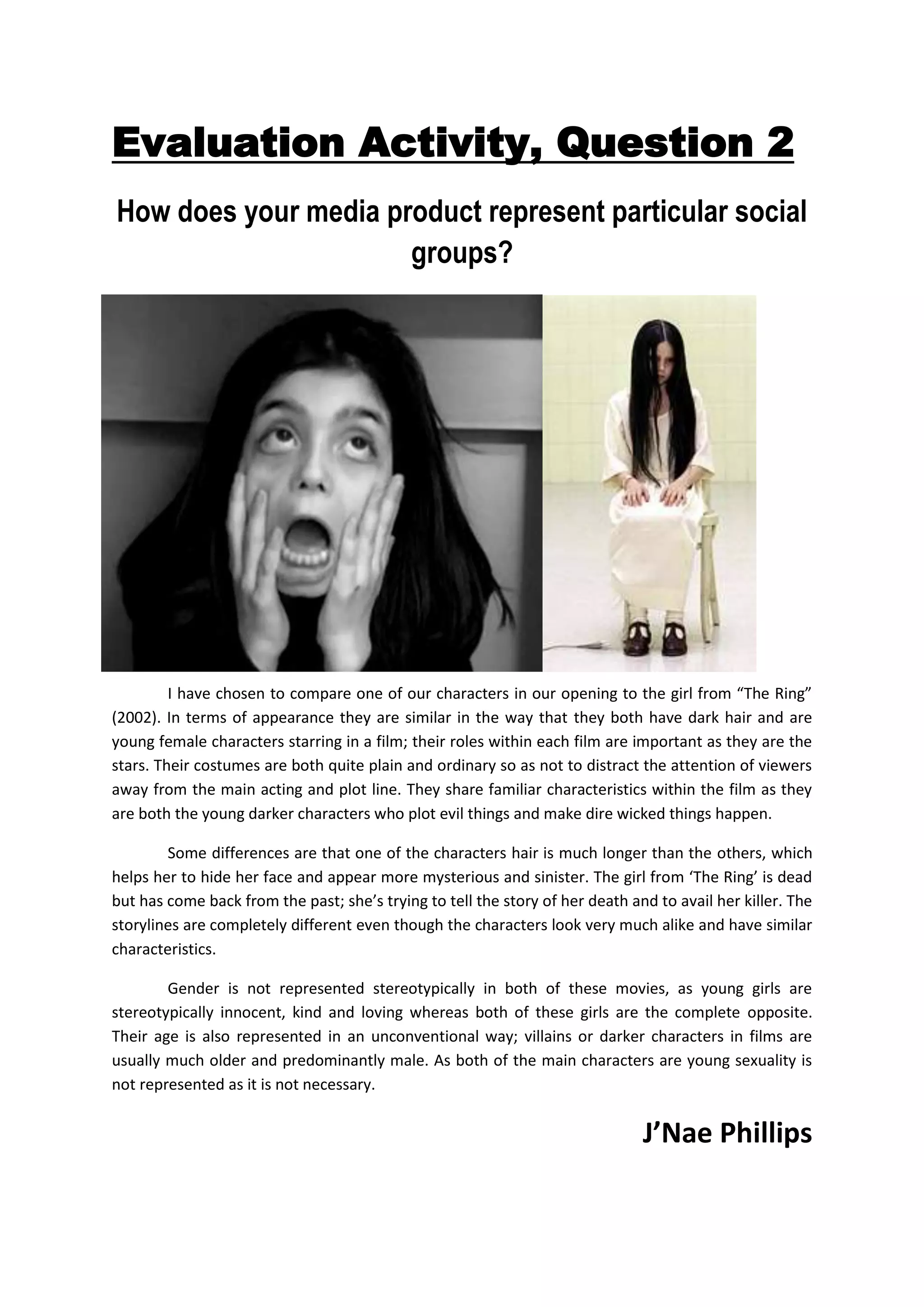 The document compares one of the characters in the student's media product to the character of Samara from the film "The Ring". Both characters are young females with dark hair who play important starring roles. Their costumes and appearances are plain and ordinary to not distract from the plot. However, one key difference is the length of their hair, with Samara's being much longer to appear more mysterious. While their looks and traits are similar, their storylines are completely different. Both films subvert stereotypes by portraying young girls in sinister roles rather than the stereotypical innocent depictions.