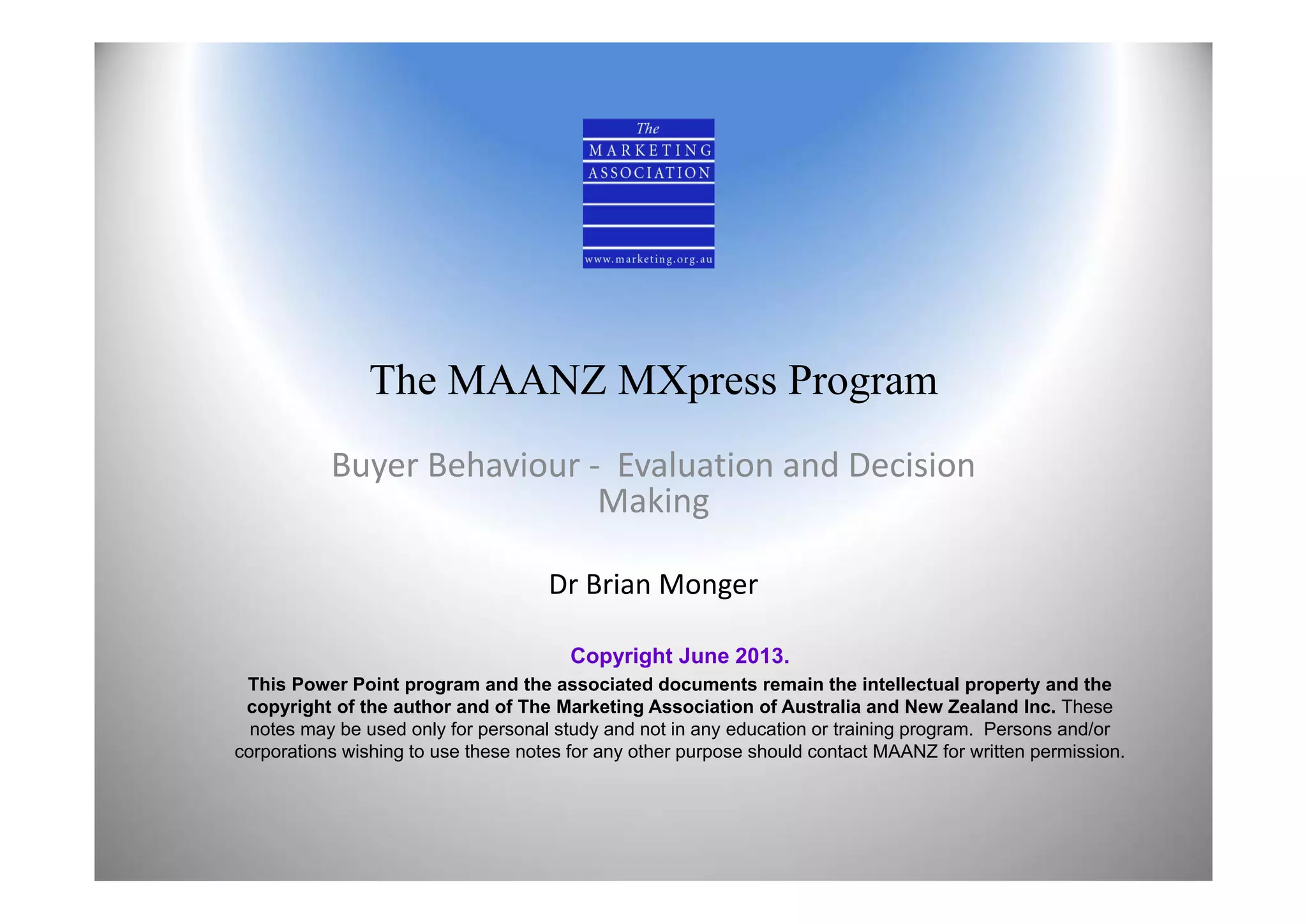 This document summarizes a PowerPoint presentation from MAANZ International on buyer behaviour and decision making. It discusses several models of decision making, including economic, passive, cognitive, and emotional models. It also outlines factors that influence decisions, such as psychological influences, decision strategies, biases, and social factors. Finally, it describes different types of shoppers and criteria consumers consider when selecting stores.