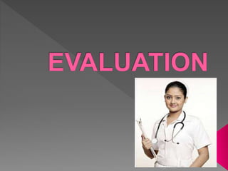 The document discusses evaluation as the final step of the nursing process. Evaluation is defined as judging the effectiveness of nursing care in meeting client goals based on behavioral responses. It is an ongoing, continuous process used to determine how well the care plan is working and ensure quality care. There are different types of evaluation, including process, outcome, ongoing, intermittent, and terminal evaluations. Evaluation involves collecting objective and subjective data to assess if client goals were met and nursing interventions were appropriate. It provides a basis for revising the nursing care plan as needed.