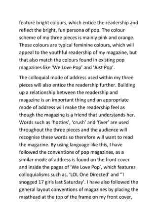 The document describes a student's coursework to create components of an original music magazine, including a front cover, contents page, and double page spread. The student researched real pop magazines to understand conventions and ensure their magazine reflected the genre. Their magazine, called Rhythmix, follows conventions such as using bright colors and a colloquial tone to appeal to its target audience of 14-18 year old girls interested in music, celebrities, and style. The student evaluates how their work achieved genre conventions and fulfilled the needs of their target readership.