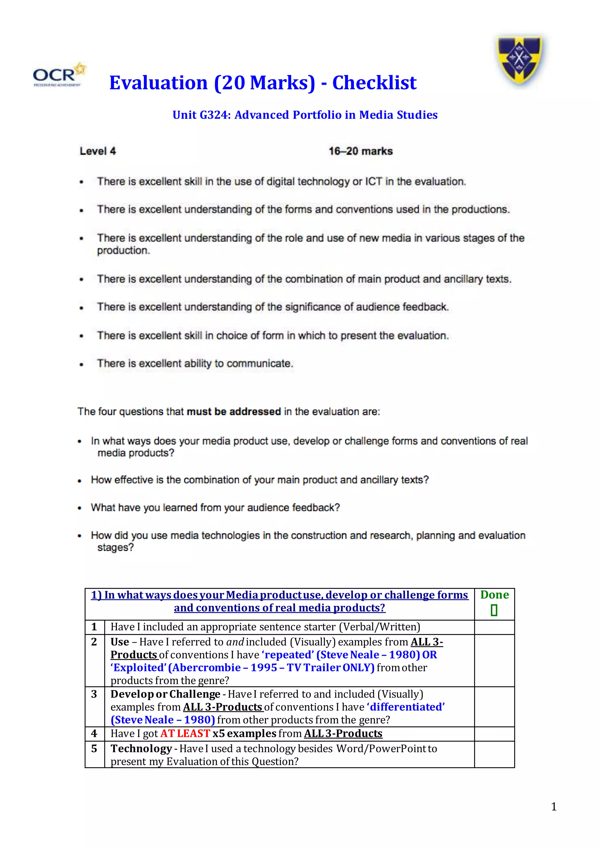 This document provides a checklist for evaluating a media studies portfolio project. It includes four questions that must be addressed: 1) How the media products use, develop, or challenge conventions of real media genres through examples from all three products. 2) How the main product and ancillary texts effectively combine through examples showing synergy from all products. 3) What was learned from audience feedback gathered from at least two formats about all three products. 4) How media technologies were used for construction, research, planning, and evaluation stages by referring to specific software features used to create each product. The checklist ensures examples are provided for all products and stages, feedback is obtained, and technologies beyond Word/PowerPoint are used.