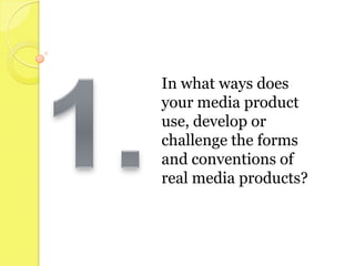The document discusses the ways in which the author's media product uses real magazine forms and conventions without challenging them. The front cover, contents page, and double page spread all incorporate typical magazine layouts, with influences taken from magazines like Blender, Sugar, Q, and Vibe. Images are used to represent the target R&B audience. Bauer Media would be a suitable distributor given their experience with similar magazines. The intended audience is described as males and females aged 16+ interested in R&B music. Features like images and puffs are used to attract this audience.
