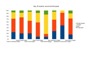 The document summarizes the results of an evaluation of a CLIL (Content and Language Integrated Learning) program from 2012. Students from Italy, Luxembourg, Poland, and Sweden were asked to rate their level of agreement with statements about an English language lesson on a scale from strongly agree to strongly disagree. The statements addressed whether the lesson made English easier to understand, speak, read and write, whether it was more interesting taught in English, and whether students wanted more topics taught in English. Graphs show the responses for each country, with most students agreeing or strongly agreeing that the lesson helped with their English skills and found it more interesting taught in English.