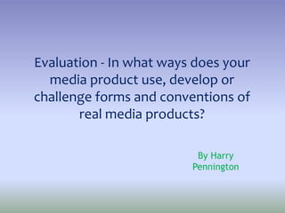 The document discusses how the media product adheres to and challenges conventions of British crime films. It adheres to conventions by using stereotypical male characters and starting with an attention-grabbing action scene. It challenges conventions by creating mystery around the character "The Suit" and using chiaroscuro lighting and less prevalent narration. The music is also slower and quieter than typical for the genre, changing the atmosphere.