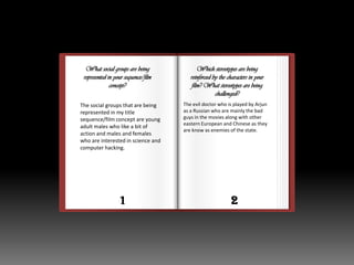 The document is an evaluation of a media product that represents certain social groups. It discusses how young adult males who enjoy action and males/females interested in science and hacking are represented. It notes that the evil doctor character, played by an actor of Russian descent, reinforces stereotypes of eastern Europeans and Chinese as enemies. However, the black character Jason challenges stereotypes of uneducated black people by being an intelligent hacker. The evaluation examines how these messages were communicated through character behaviors and plot elements.