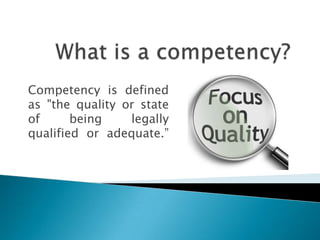 The document discusses competency evaluation approaches including norm-referenced and criterion-referenced. It also discusses Singapore's use of a teacher competency model consisting of five competency clusters that is used for hiring, evaluation, career pathing, and determining bonuses. The competency model along with performance goals at each employment stage help continuously improve teaching and educate students.