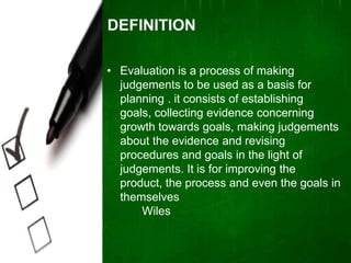 This document discusses concepts and principles of evaluation in education. It defines evaluation as a process of making judgements to establish goals, collect evidence of progress, make assessments, and revise procedures and goals based on those assessments. Evaluation is used to improve outcomes, processes, and goals. Formative evaluation refers to assessment during a program to identify progress and make improvements, while summative evaluation examines final effects and outcomes. The document outlines various evaluation types, purposes, characteristics, and models to systematically collect and analyze information to determine how well students are achieving educational objectives.