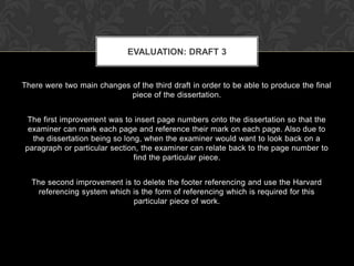 The third draft of a dissertation was improved in two key ways: 1) page numbers were added so the examiner could mark and reference specific pages when reviewing the lengthy document, and 2) the footer referencing was removed and the Harvard referencing system was implemented as required for the work.