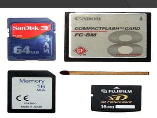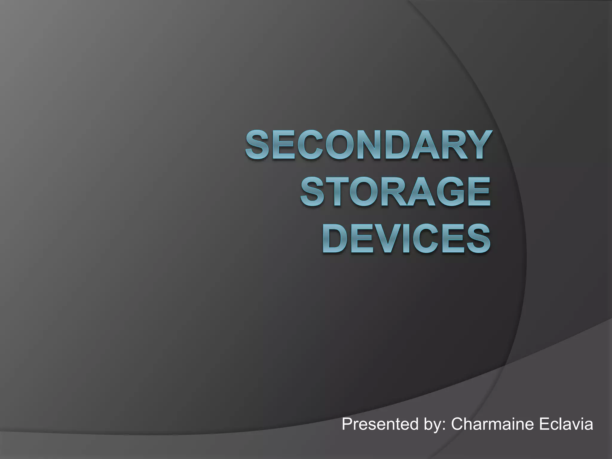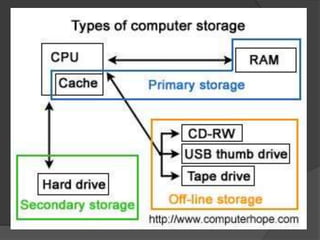 Secondary storage devices hold information regardless of whether the computer has power. Examples include hard disk drives and floppy disks. While primary storage is faster, secondary storage is needed for today's computers to store programs and personal data due to limitations on primary storage sizes and prices. Common secondary storage devices discussed include hard disks, CD-ROMs, CD-Rs, USB flash drives, and memory cards.