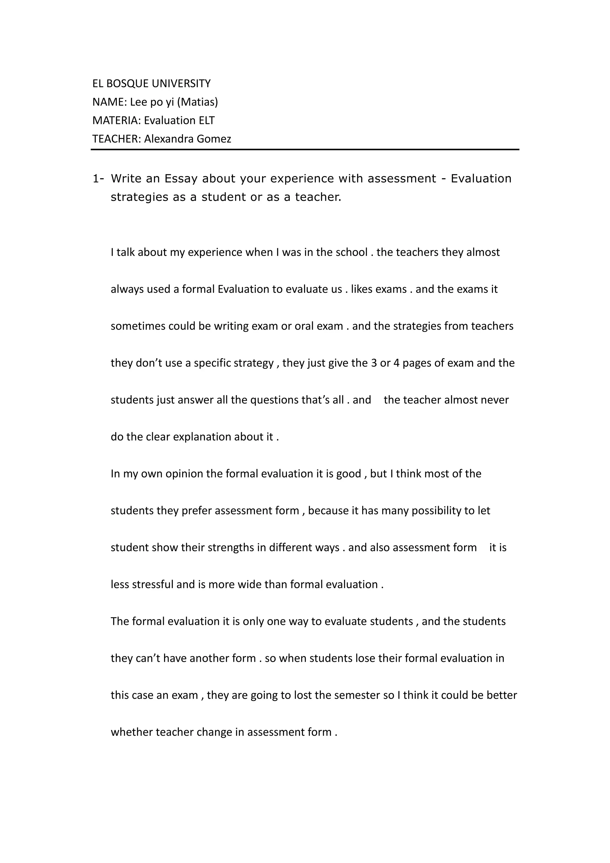 The document discusses the author's experience with assessment strategies as a student. It notes that teachers primarily used formal exams to evaluate students, which involved answering questions with no clear explanations. While formal exams are good, many students prefer assessment forms that allow them to demonstrate their strengths in different ways and are less stressful than exams. Assessment forms provide more flexibility than single exams, where failing an exam means failing the semester. The author believes teachers should consider changing to assessment forms for evaluating students.