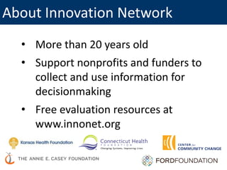The document outlines key evaluation essentials for nonprofits, covering the evaluation lifecycle and best practices for effective information use in decision-making. It includes insights from experts Johanna Morariu and Ann Emery, emphasizing the importance of planning, data collection, and communication in the evaluation process. The resource also offers links to further information and support from the Innovation Network.