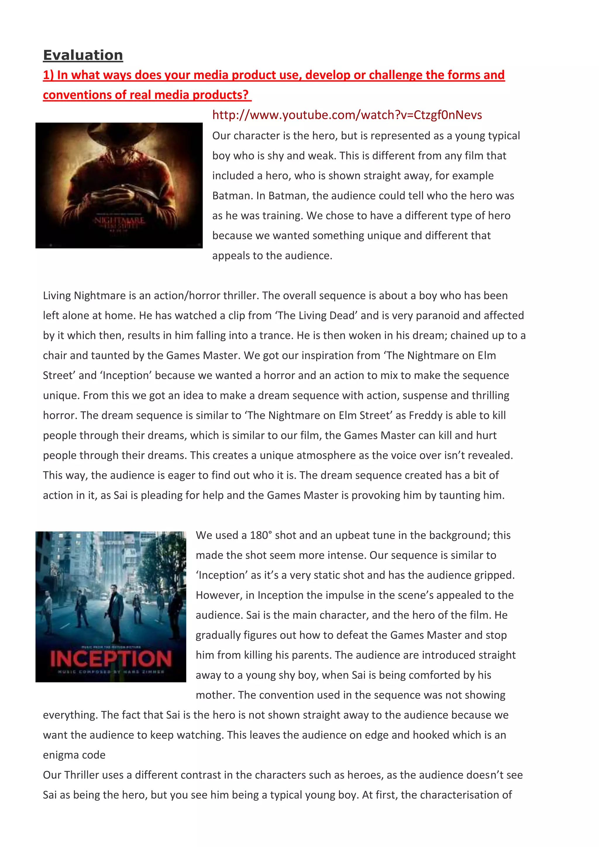 The author discusses their media product, a thriller film titled "Living Nightmare". It uses conventions like a shy, young male protagonist who is revealed to be the hero. It represents a typical middle-class British family and portrays the father as dominant. The dream sequence is inspired by films like "Nightmare on Elm Street". They hope to attract 15-20+ year old audiences who prefer horror and action genres with complex twists. The author analyzes shots, music, and editing choices used to attract this audience and build suspense. They also discuss the technologies and skills learned through creating the product.