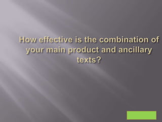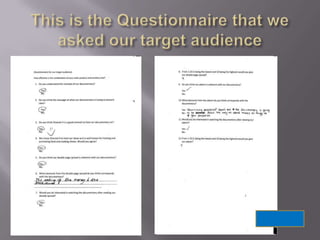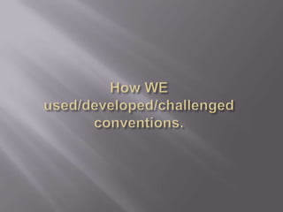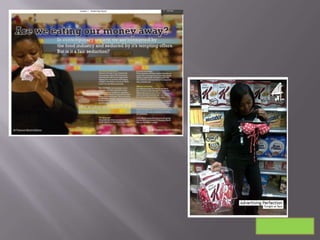 The document discusses the development and use of conventions in documentaries and advertising. It describes using a young presenter, expert opinions, statistics and reenactments in "Food Inc." and focusing on one topic at a time in "Big Fat Gypsy Wedding." For their own documentary, the group used a sociology expert and animated figures to represent survey responses. Their advert features a girl holding Special K to link to questions about promoting an ideal image, and their double page spread shows eating money to link to themes of capitalism. They selected accessible newspapers and branded everything with the Channel 4 logo for consistency.