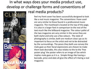 The document discusses how the media product develops conventions of real music magazines in its front cover design, layout, and photography style. It also notes how the contents page