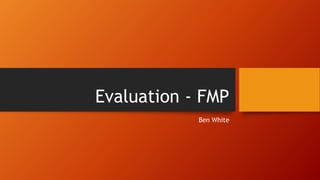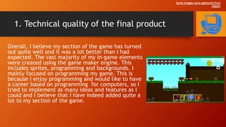 Ben White evaluated his section of a group game development project. He believes the technical quality of his section turned out well, especially the programming elements. He learned valuable programming skills like using states, movement, and gravity. Graphically, he achieved his simple and blocky art style goal despite needing to improve animation. He utilized various software like Game Maker, CamStudio and Reaper. Some minor glitches occurred but overall gameplay was good. He met most of the group's original intentions and managed time well, though underestimated some tasks. The target audience was male and female teenagers who would appreciate retro style elements.