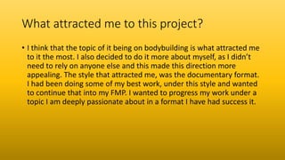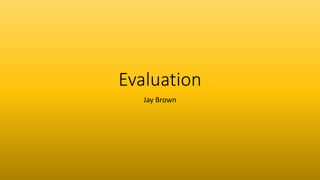 Jay Brown evaluated his final media production project. He was initially attracted to the project due to its focus on bodybuilding, a topic he is passionate about. He undertook research on similar documentaries and his target audience to develop his ideas. Throughout the project, Jay refined his ideas in PowerPoint presentations and decided to make the documentary more personal. In the end, Jay was very happy with the outcome of his project and felt it achieved a distinction-level quality. He believed the documentary successfully applied the conventions of the genre and appealed to his target audience. Overall, Jay saw significant improvements in his skills and felt the project was a success.