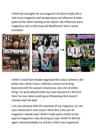 The document summarizes the author's experience creating a magazine layout using Photoshop and Fireworks. They felt more comfortable with Photoshop after using it for various tasks like cropping images and working with layers. They learned they can expand their work by using Photoshop and Fireworks effects in future media projects, such as editing photos, creating logos, and designing magazines. The author believes the strengths of their magazine are that it looks like a real music magazine and is similar to influences like Kerrang and RockSound magazines. They were pleased with their cover but think they could have organized the color scheme better.