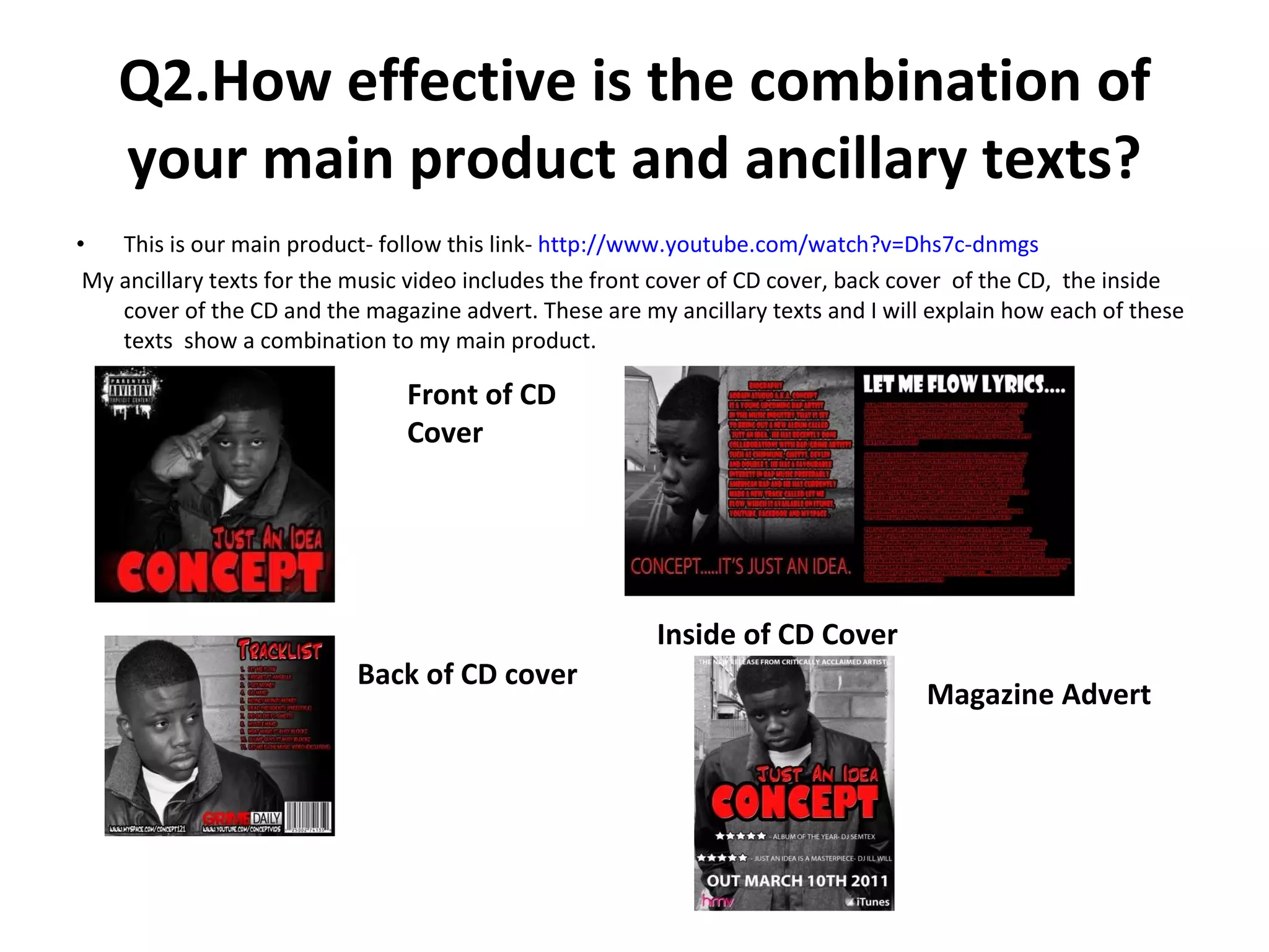 The document discusses how various ancillary texts for a music video - including a CD cover, magazine advertisement, and inside liner notes - effectively combine and relate to the main music video product. Specific shots, colors, and themes were carried over from the video to create consistency across the materials. For example, the magazine ad uses a similar shot of the artist against a red backdrop as in the video. The CD cover also references shots and color schemes used in the video to promote the artist. This combination of ancillary texts helps tell the overall story and message of the music video.