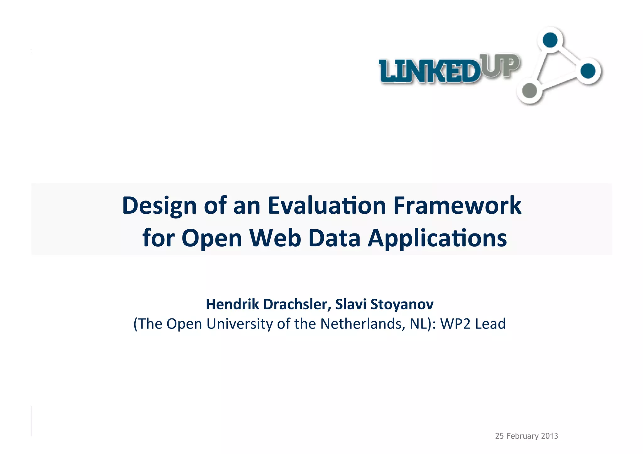 The document discusses the development of an evaluation framework for open web data applications. It begins with an overview of the growth and diversity of data on the web. It then outlines the process used to develop the framework, which involved inviting experts to contribute evaluation criteria, sorting and rating the criteria, and analyzing the results. Group concept mapping was used to help establish clusters of criteria and identify priorities. The document concludes with examples of the concept mapping outputs, which help visualize the collective view that emerged from the expert contributions and analysis.