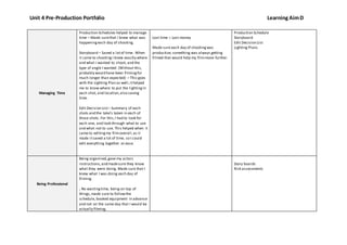 The document discusses project management tasks for a film production. It describes how the student managed people by creating call sheets and production schedules. It also discusses managing resources like cameras, booking equipment, and creating budgets. Time was managed through production schedules, storyboards, and edit decision lists. Being professional, organized, and avoiding wasted time and unproductive days also helped. Areas for improvement include doing storyboards earlier and ensuring transportation is arranged. Risk assessments and crisis planning could also be strengthened for future productions.